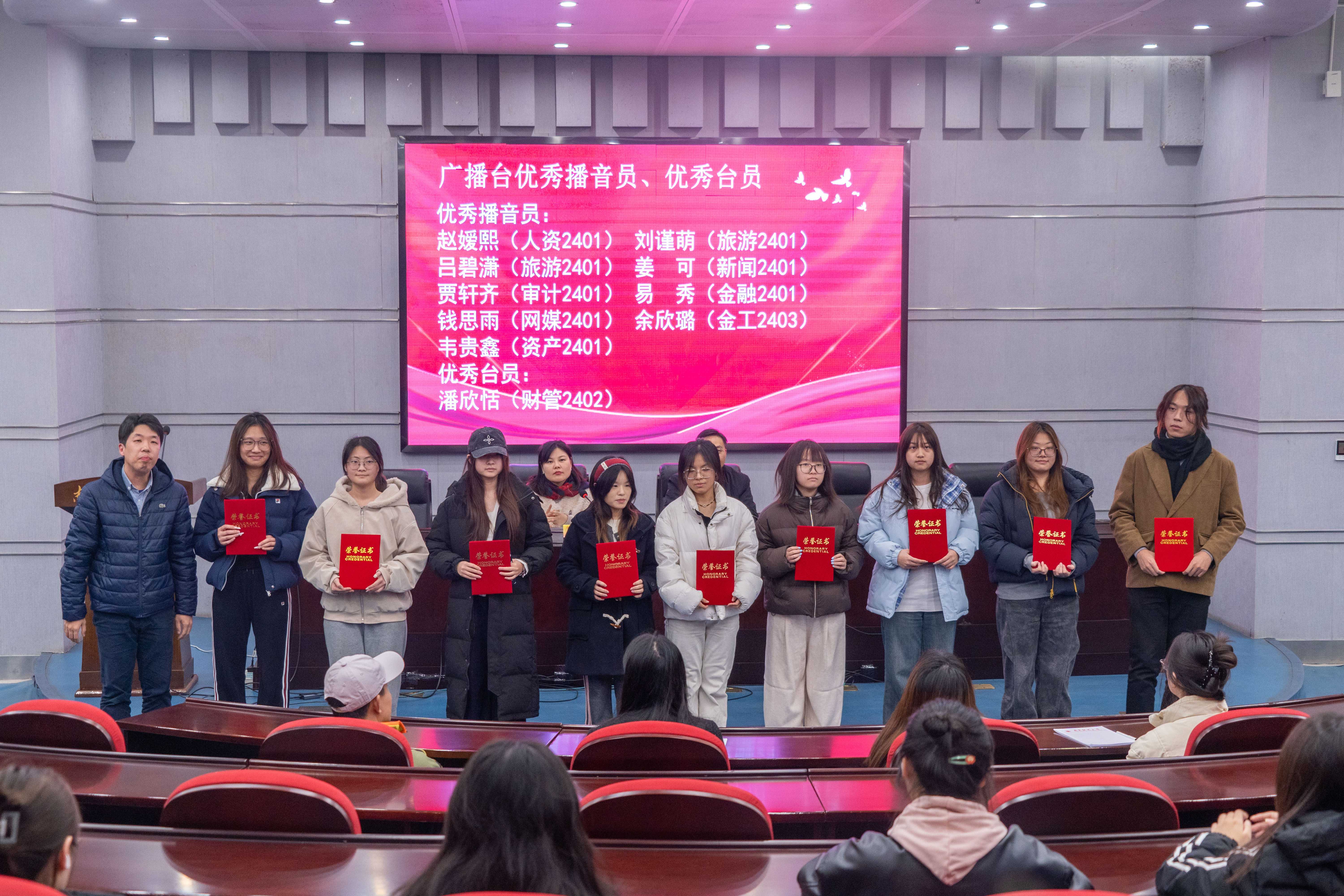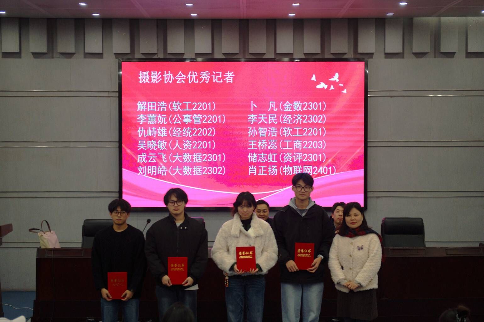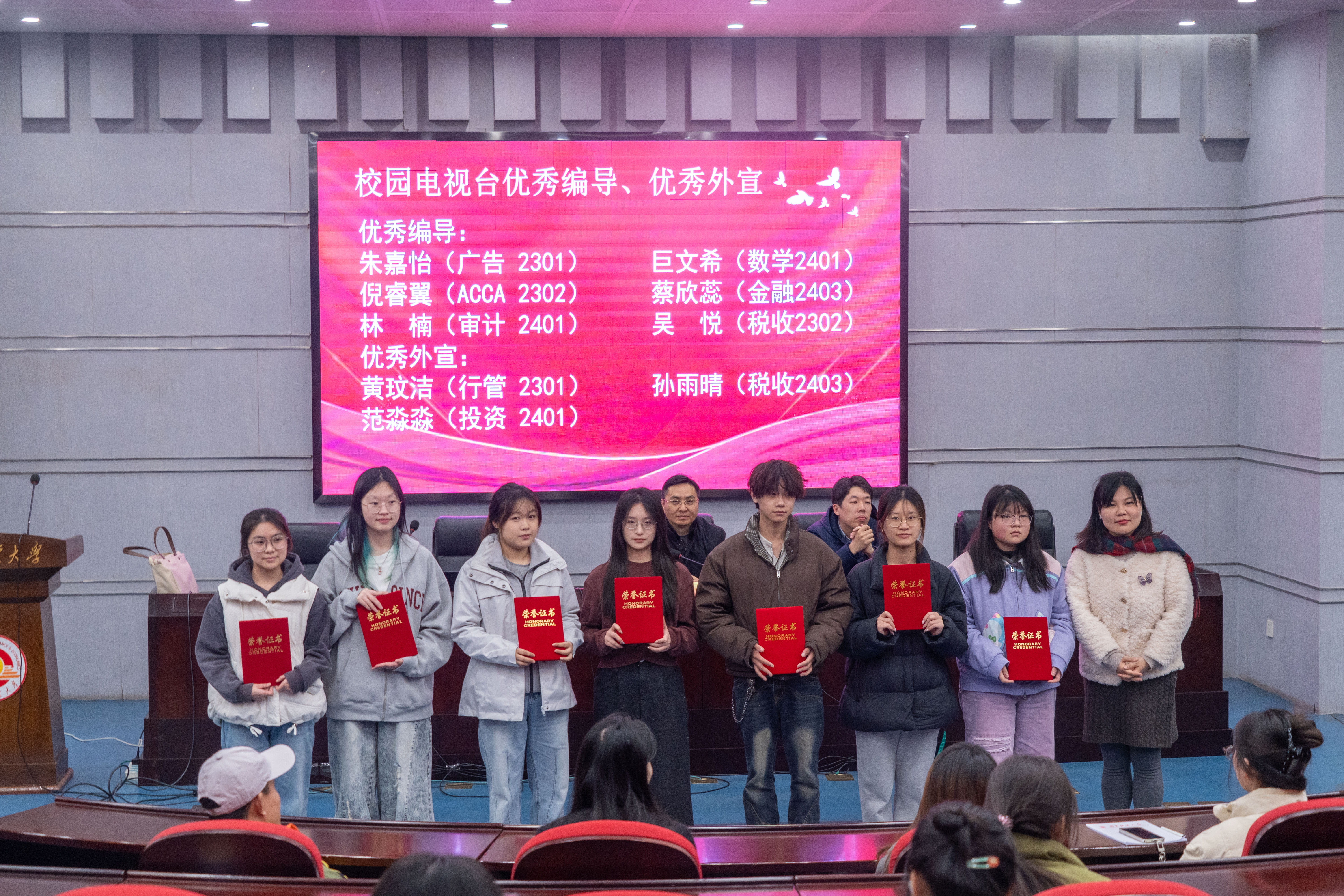 随后,朱军部长、席飞副部长为优秀学生代表颁发荣誉证书。本年度共有69名同学荣获“优秀记者”“优秀播音员”“优秀编导”等荣誉称号。