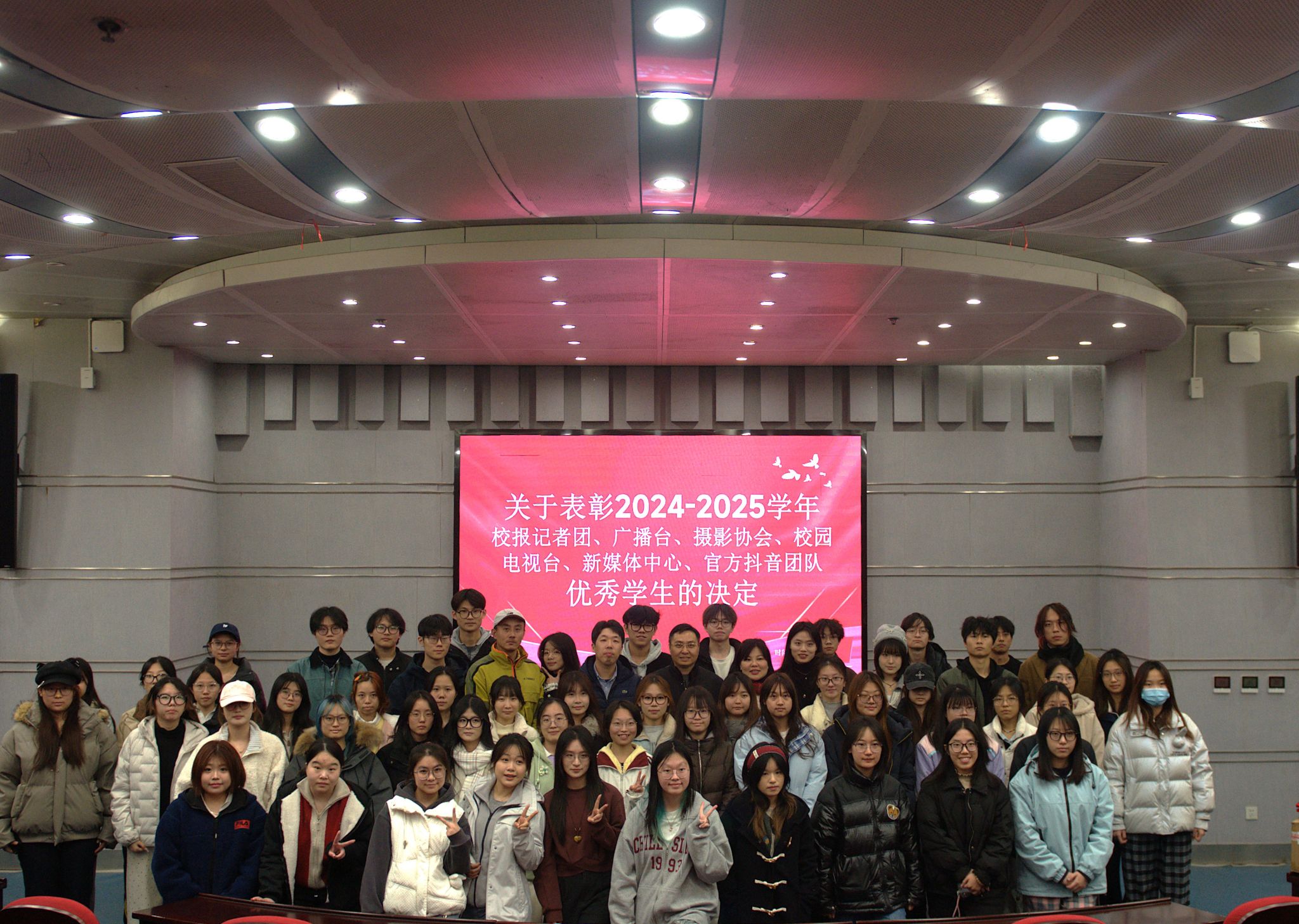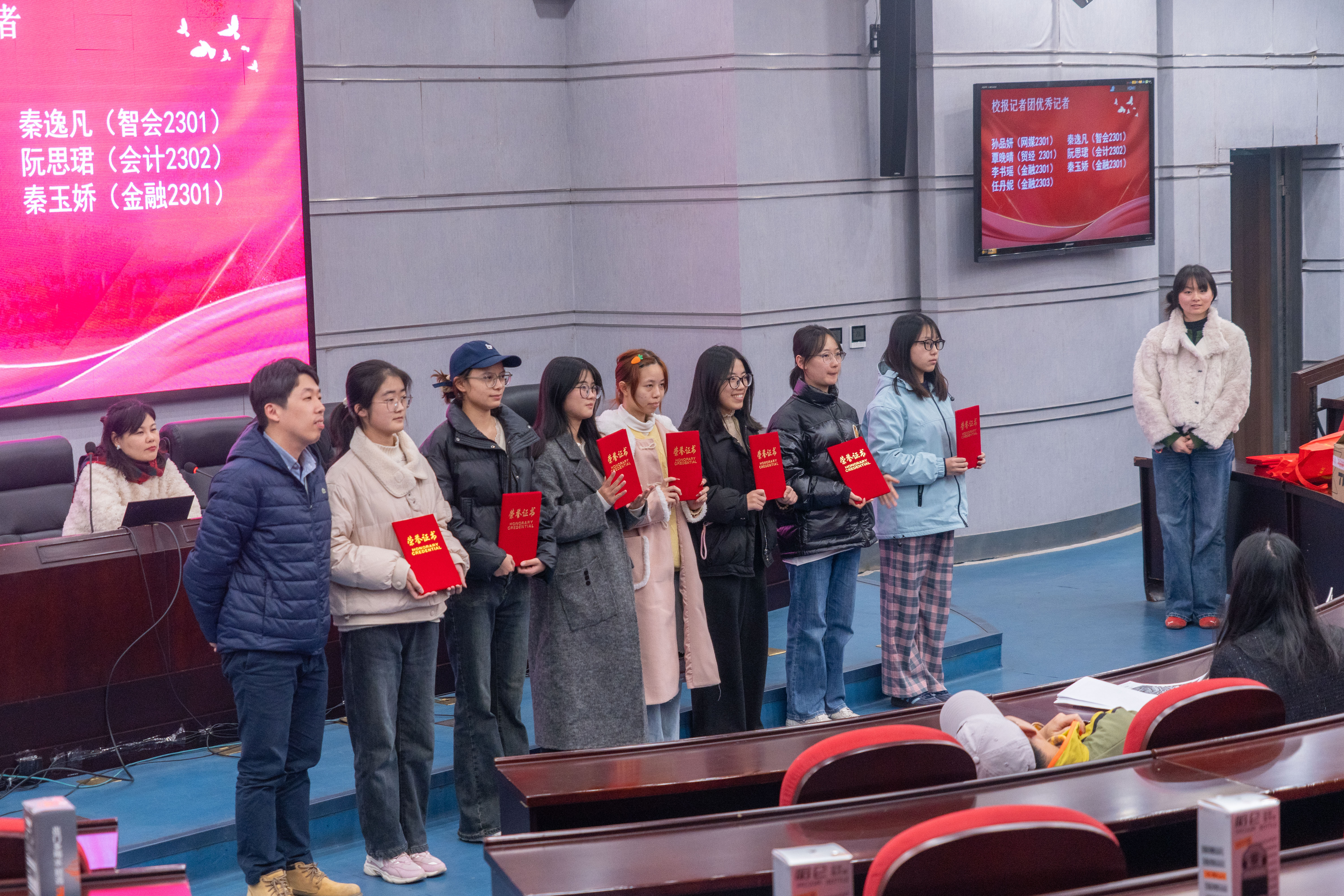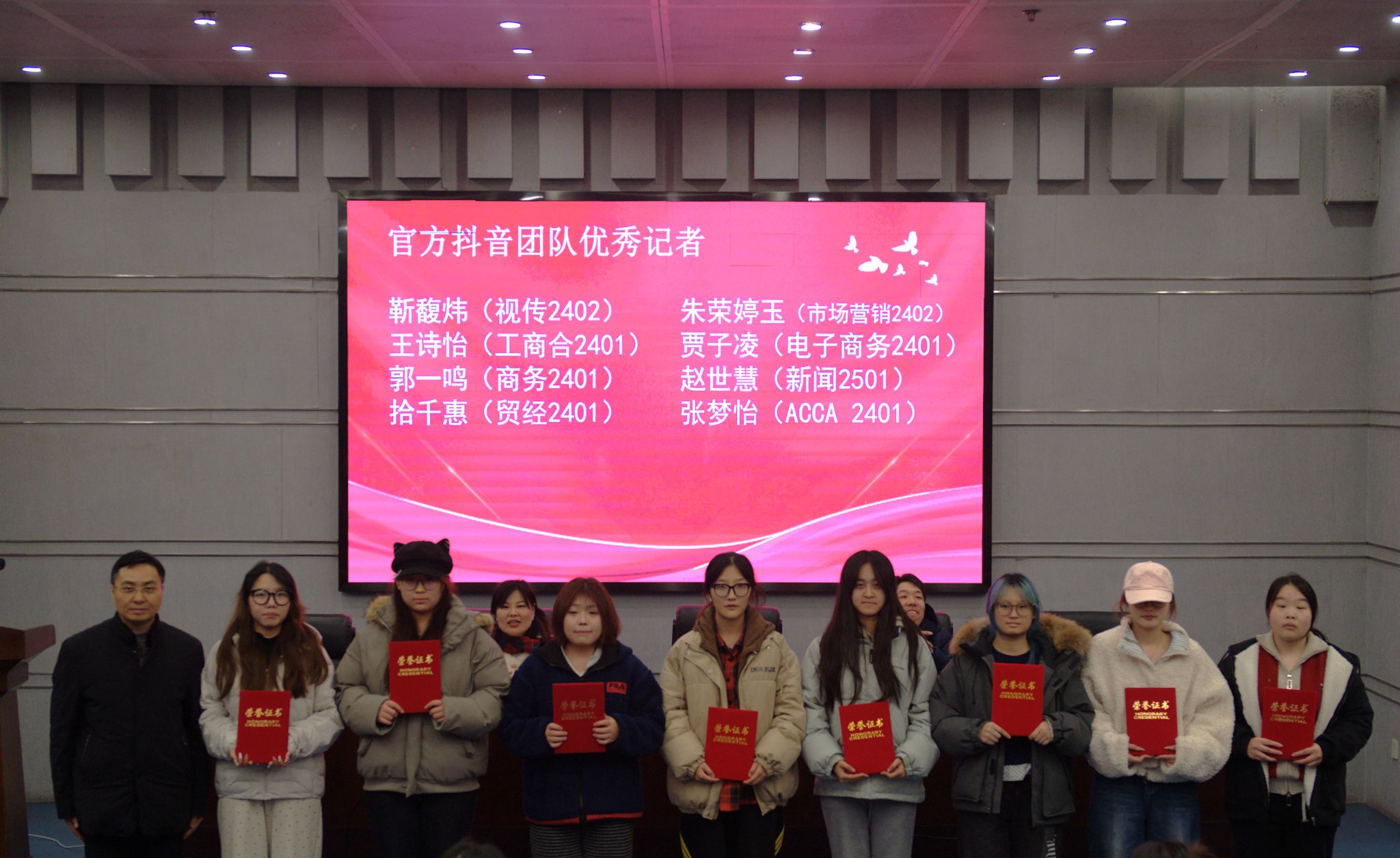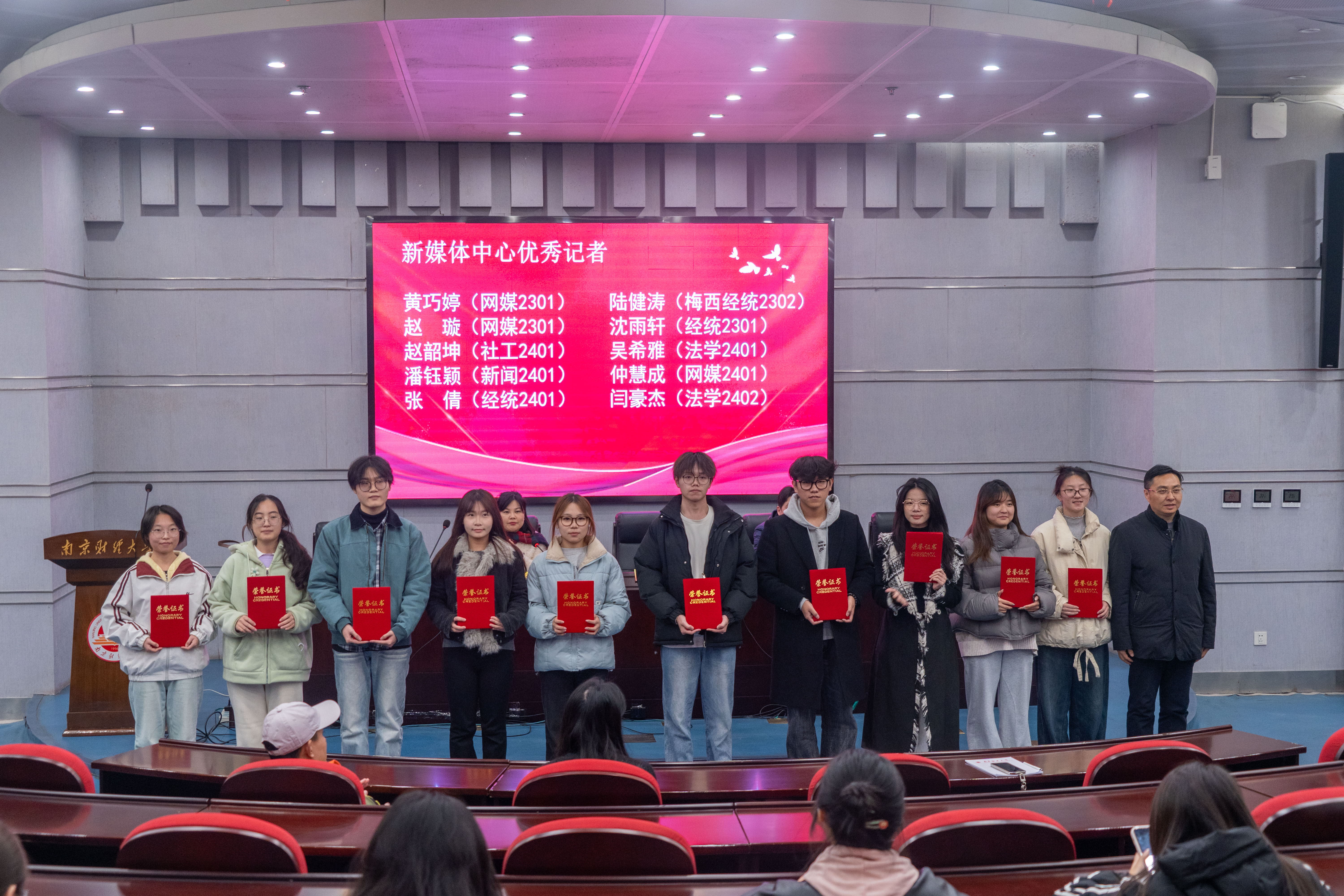随后,朱军部长、席飞副部长为优秀学生代表颁发荣誉证书。本年度共有69名同学荣获“优秀记者”“优秀播音员”“优秀编导”等荣誉称号。