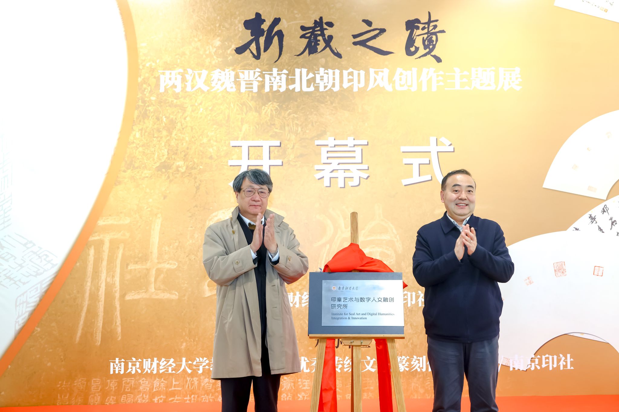 12月2日下午,“西泠印社藏历代印章原拓题跋扇面展”暨“斩截之迹——两汉魏晋南北朝印风创作主题展”在我校美术馆开幕。全国政协常委、校长程永波,中国文联副主席、西泠印社副社长兼秘书长陈振濂,党委常委、副校长叶林祥,西泠印社党委委员、社委会副主任王丽艳,校党政办,党委宣传部,科研院,艺术教育中心等部门负责人,以及我校本次江苏艺术基金篆刻人才培训班全体学员、篆刻传承基地师生和书法篆刻专业研究生代表共同参会。开幕式上,程永波校长与陈振濂副主席共同为“南京财经大学印章艺术与数字人文融创研究所”揭牌。校科学研究院副院长肖玉杰主持本次活动。
