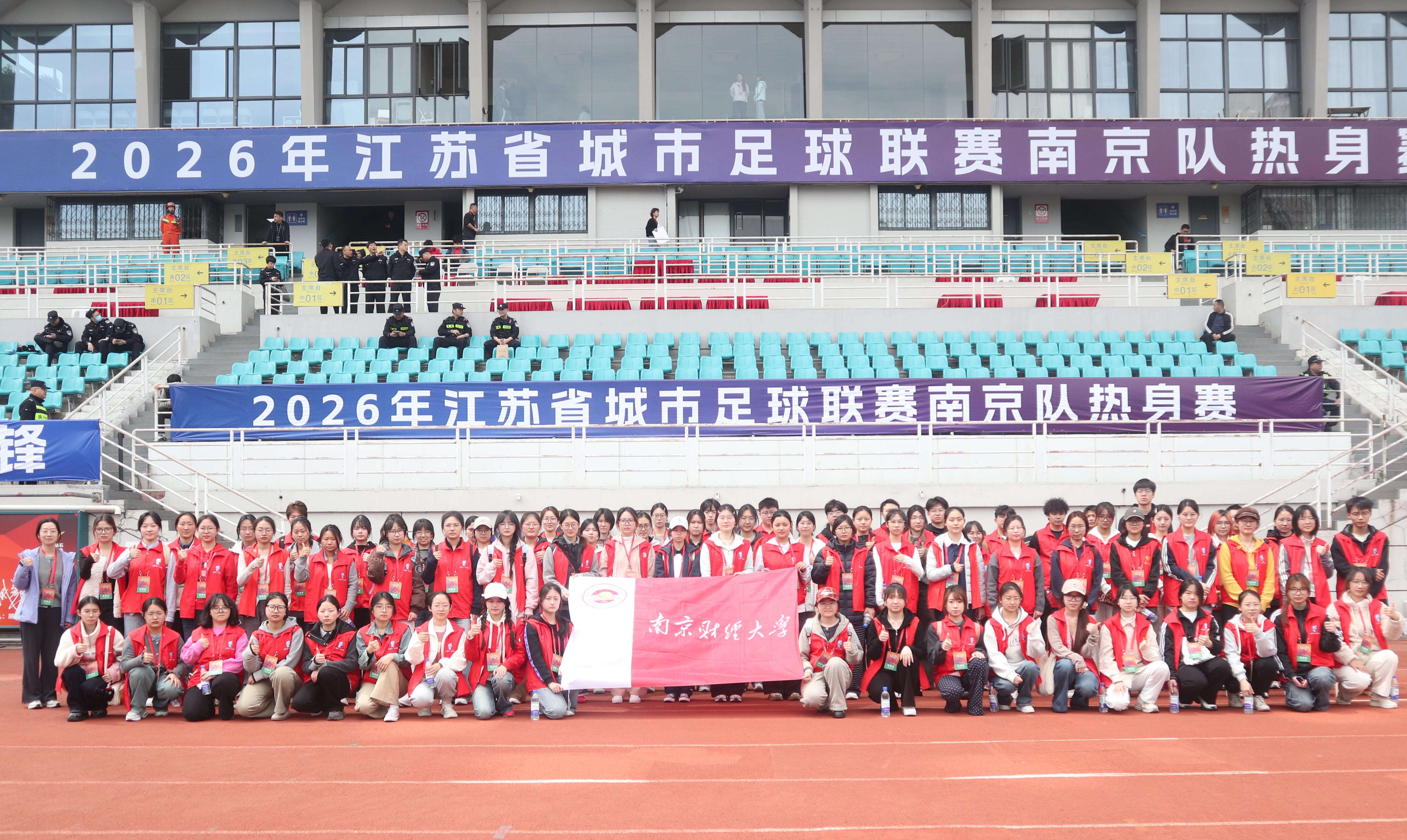 3月28日,2026年江苏省城市足球联赛(苏超)南京队热身赛(南京队VS青岛海牛U21队)在五台山体育中心火热开赛。在南京团市委的统筹协调下,校团委、校青年志愿者协会积极响应,组织80余名志愿者迅速集结,奔赴赛场。我校青年以专业的服务、饱满的热情,圆满完成了赛事保障任务,成为绿茵场边一道亮眼又温暖的青春风景线。