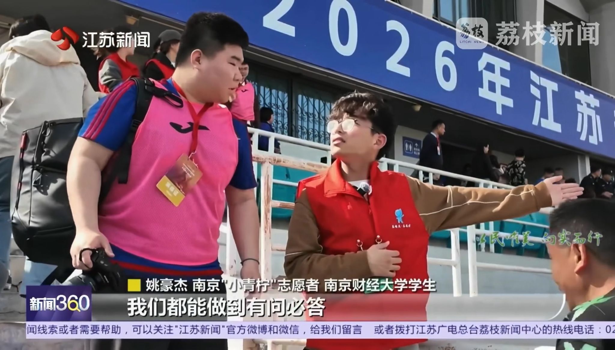 比赛当天,经济学院经统2401班陈静、财政与税务学院财政2402班姚豪杰作为志愿者代表接受了江苏广电荔枝新闻记者采访,他们表示:“赛场的温度,由我们来传递;现场的精彩,由大家去享受!”